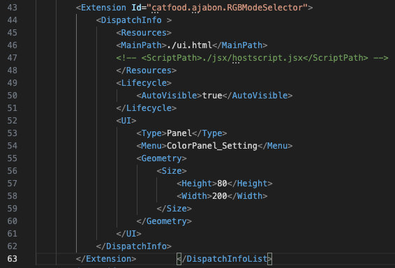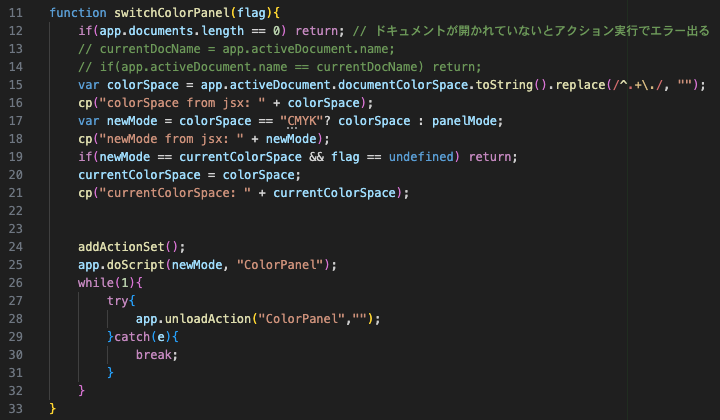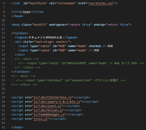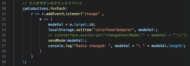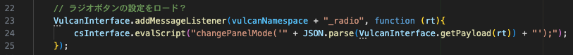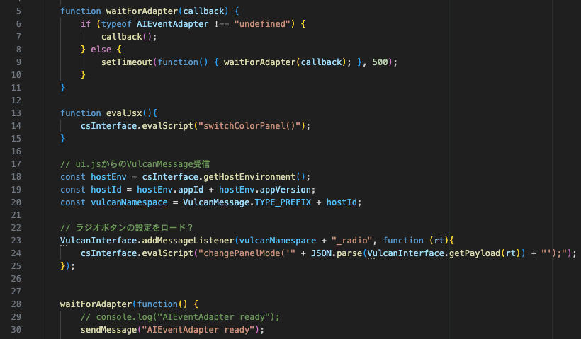jsxは1つしか用意していなくて、ColorPanelAdapterと同時に参照するとローカル変数の挙動がどうなるか想像したくなかったので、こっちではコメントアウト。こっちからjsxに用事があるときはVulcanInterfaceでColorPanelAdapterを経由するようにしました(後述のjs参照)。