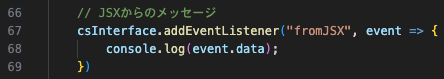 ついでに、jsxからコンソール出力したいときはこのui.jsで受け取って渡しています。
