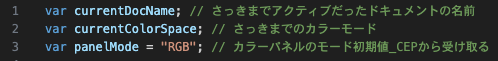 panelModeはUIのRGB/HSBを覚えておくもの。初期値として”RGB”を定義してあります。