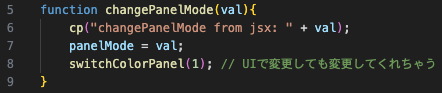 changePanelMode関数は、ui.jsのラジオボタンの名前を受け取ってpanelMode変数を上書きするもの。