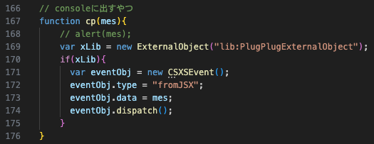 ふだんjsx単体を書くときは$.writeln か alert を出しているんだけど、これはコンソールに出すべくui.jsに送信するやつです。Ten A師匠から授かりました。